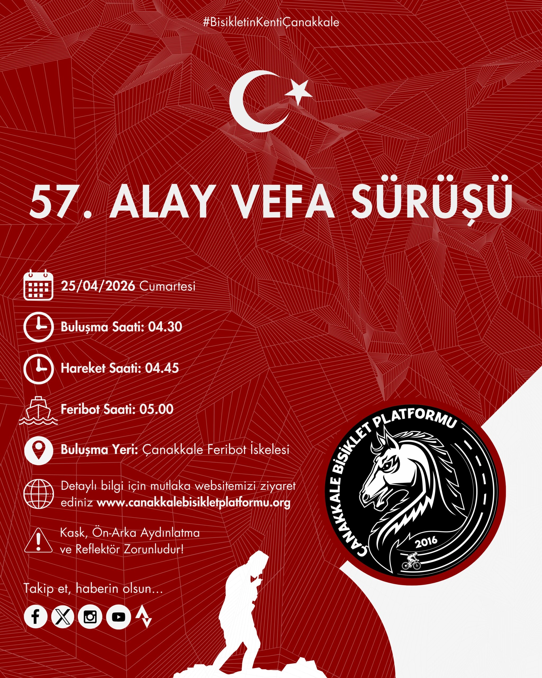 57. Alay Vefa Yürüyüşü, Çanakkale Savaşları’nda destan yazan 57. Piyade Alayı şehitlerini anmak amacıyla her yıl 25 Nisan’da, Gençlik ve Spor Bakanlığı öncülüğünde binlerce gencin katılımıyla Gelibolu Yarımadası’nda düzenlenen tarihi bir anma yürüyüşüdür. Kocadere Kamp Alanı’nda başlayan yürüyüş, Conkbayırı’nda sona ermekte ve şehitlerin izinde manevi bir atmosferde gerçekleştirilmektedir.