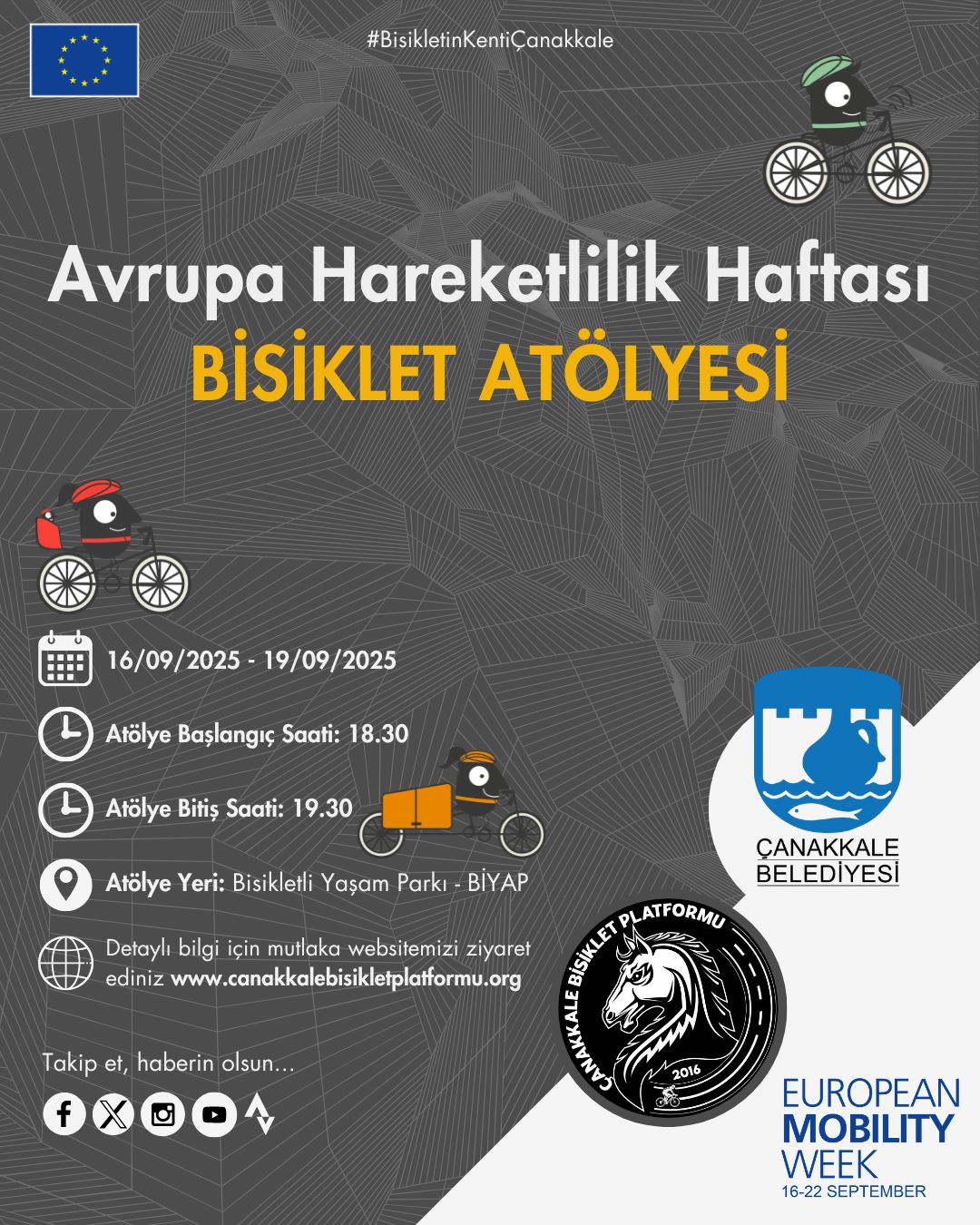 Çanakkale Bisiklet Platformu olarak Çanakkale Belediyesi tarafından koordine edilen temiz hareketliliği ve sürdürülebilir kentsel ulaşımı teşvik etmenin yanı sıra halk sağlığı ve yaşam kalitesini artırmaya yönelik bir organizasyon olan ve bu yıl “Herkes için Hareketlilik” teması ile 16-22 Eylül 2025 tarihleri arasında gerçekleştirilecek Avrupa Hareketlilik Haftası kapsamında 16-19 Eylül 2025 tarihleri arasında 5-60 yaş arası bisiklet öğrenmek isteyen herkesi Avrupa Hareketlilik Haftası – Bisiklet Atölyesi’ne bekliyoruz.