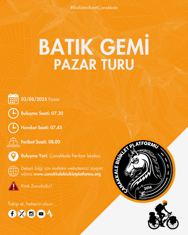 - Tur katılımcıları, tur süresince meydana gelebilecek herhangi bir kaza, yaralanma, sağlık problemi veya kişisel eşyaların kaybı gibi durumlardan kendisinin sorumlu olduğunu kabul eder. Çanakkale Bisiklet Platformu, bu tür durumlardan doğabilecek zararlardan sorumlu tutulamaz.