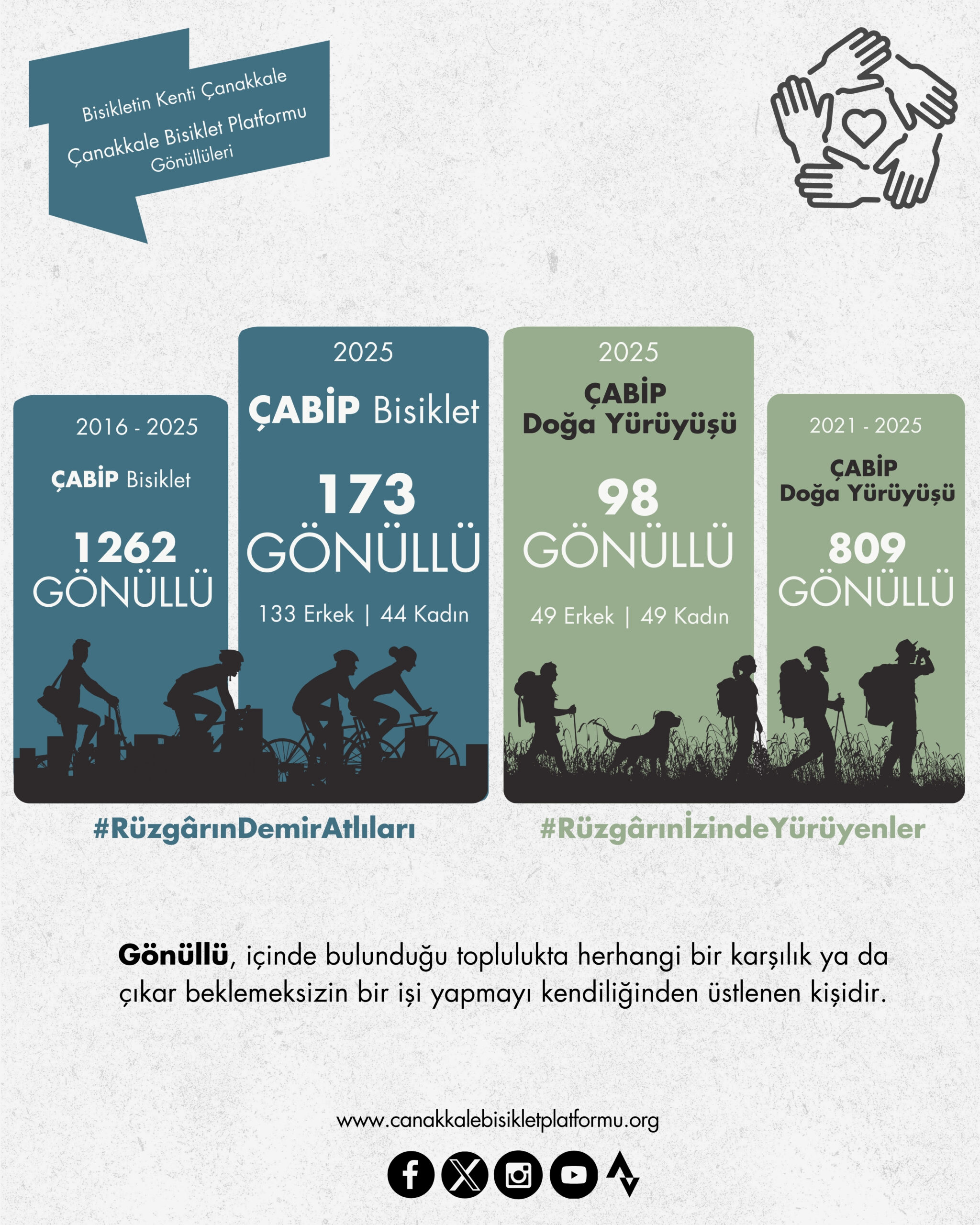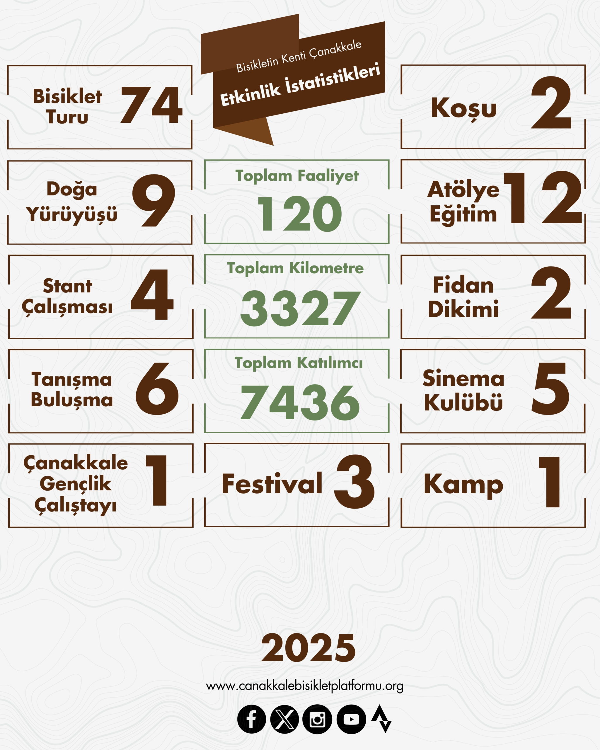 2025 yılında 36 farklı ÇABİP bisiklet turu, doğa yürüyüşü, eğitim, atölye, kamp ve etkinlik sorumlusu gönüllülerimiz ile 365 günün 120 gününde ÇABİP faaliyeti gerçekleştirilmiştir.