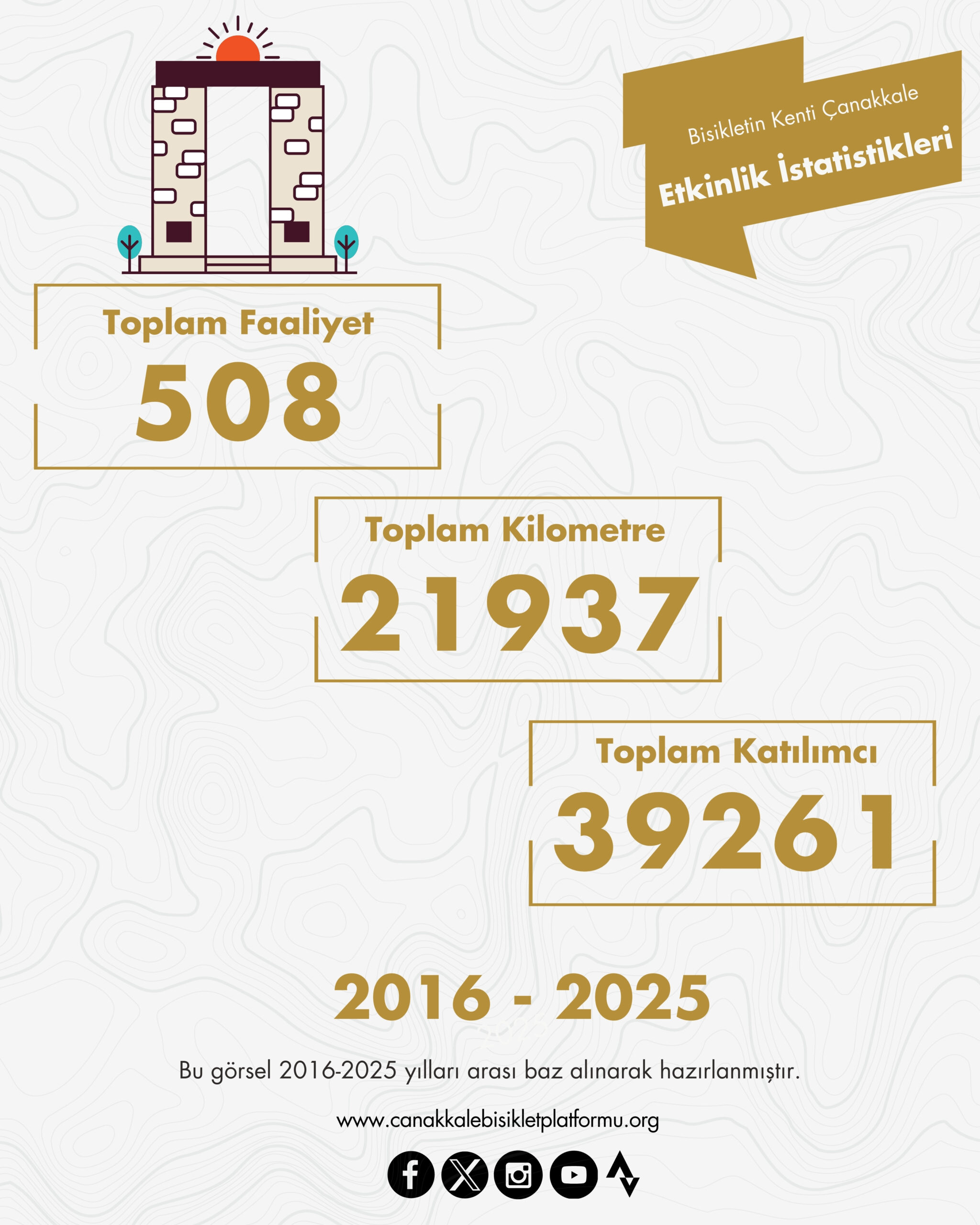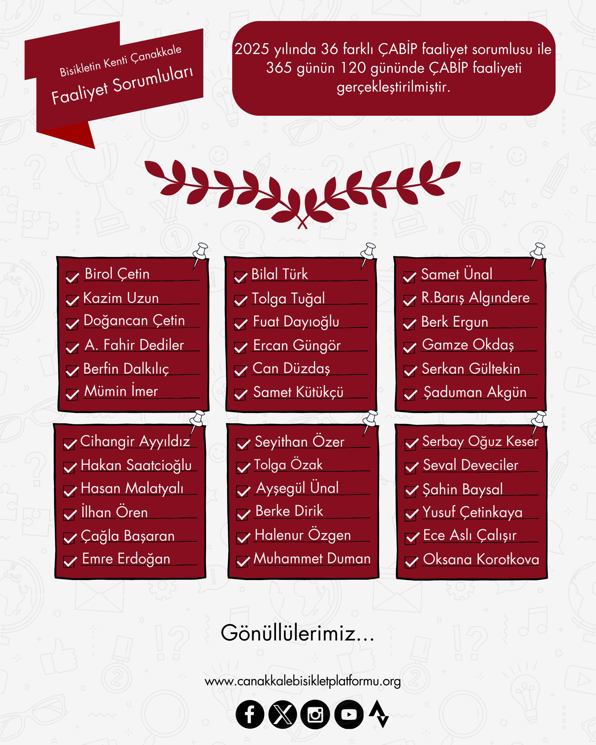2025 yılında etkinliklerimize katılan, destek olan, projelerimizi gerçekleştirmemize vesile olan ve çalışmalarımıza destek veren kurum ve kuruşlarımıza, gönüllülerimize, bisikletseverlere ve Çanakkale halkına çok teşekkür ederiz.