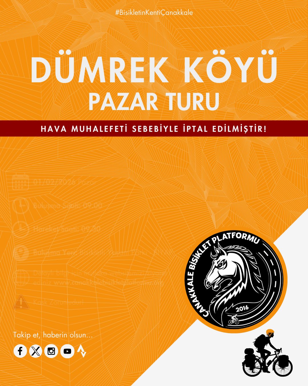 1 Şubat 2026 Pazar günü gerçekleştirmeyi planladığımız Dümrek Köyü Pazar Turu hava muhalefeti sebebiyle sürüş güvenliğini tehlikeye atmamak adına İPTAL EDİLMİŞTİR!