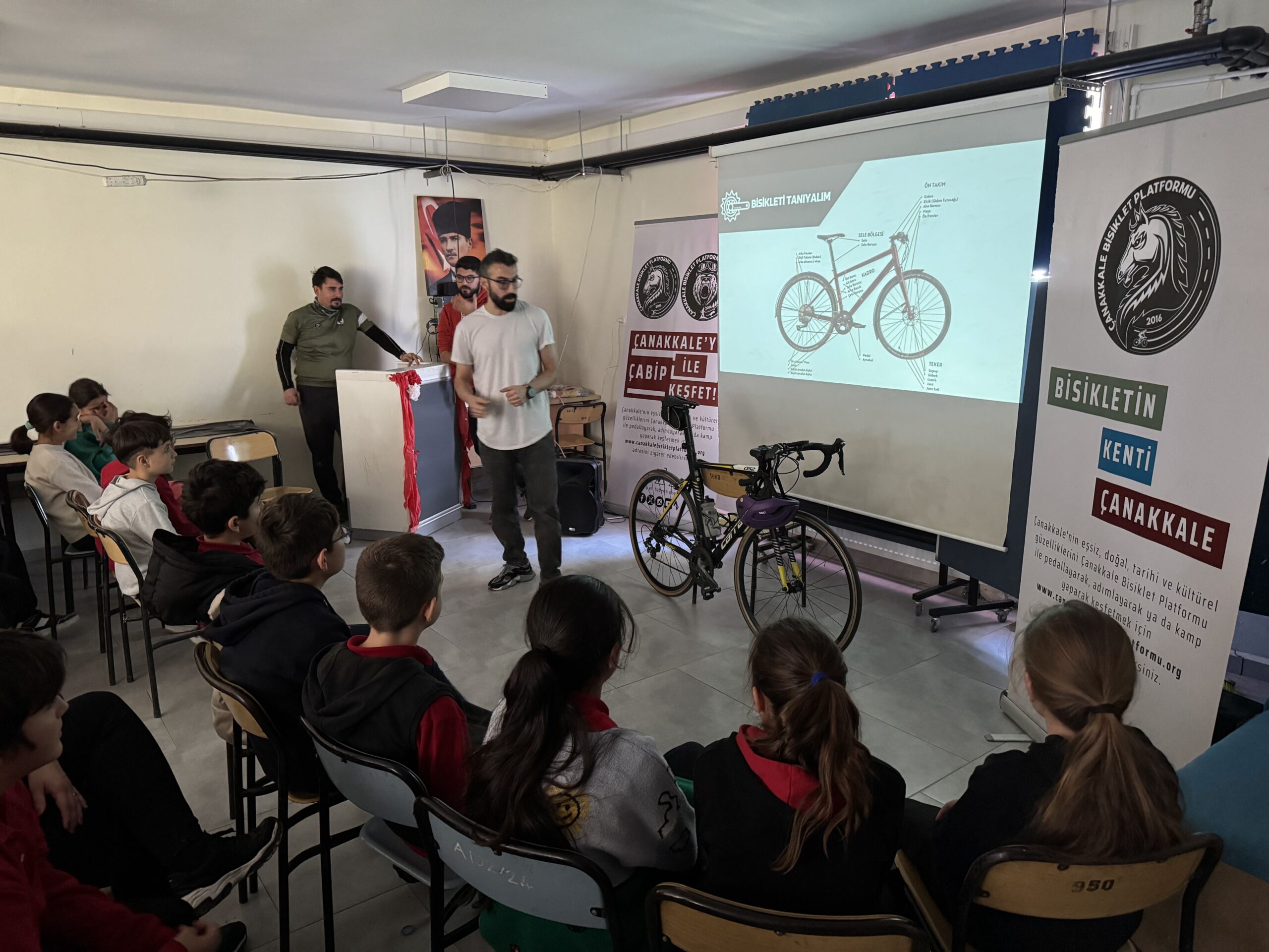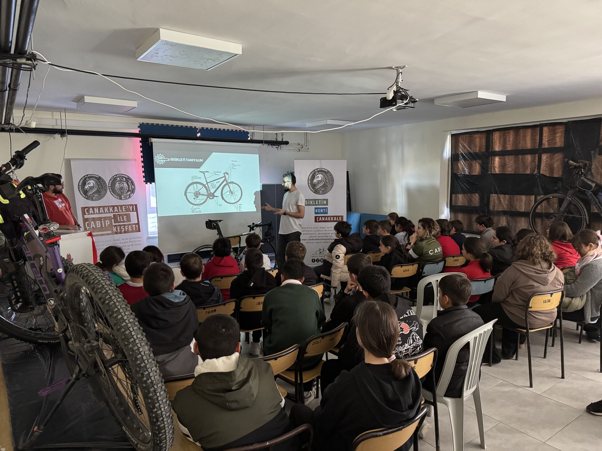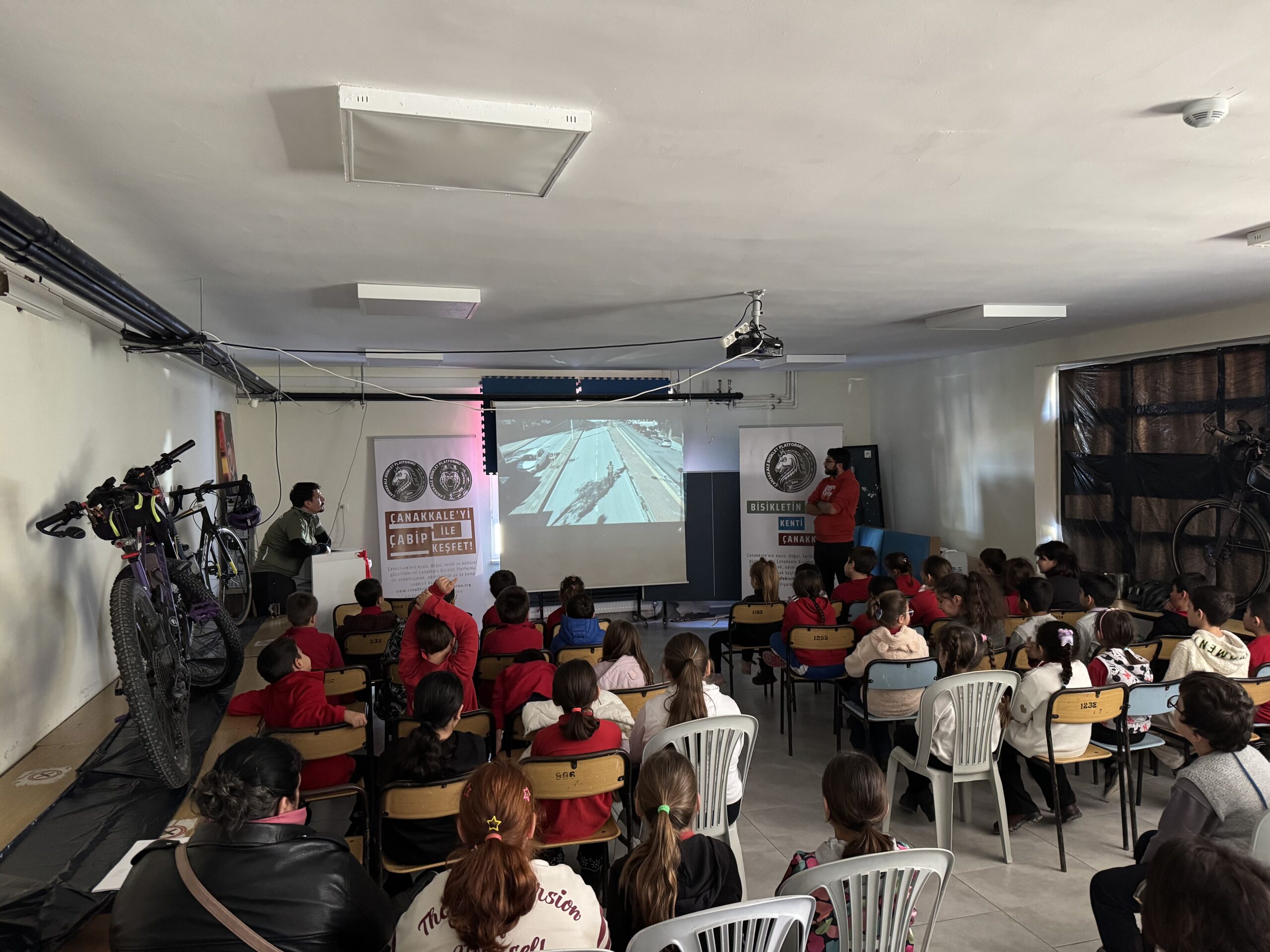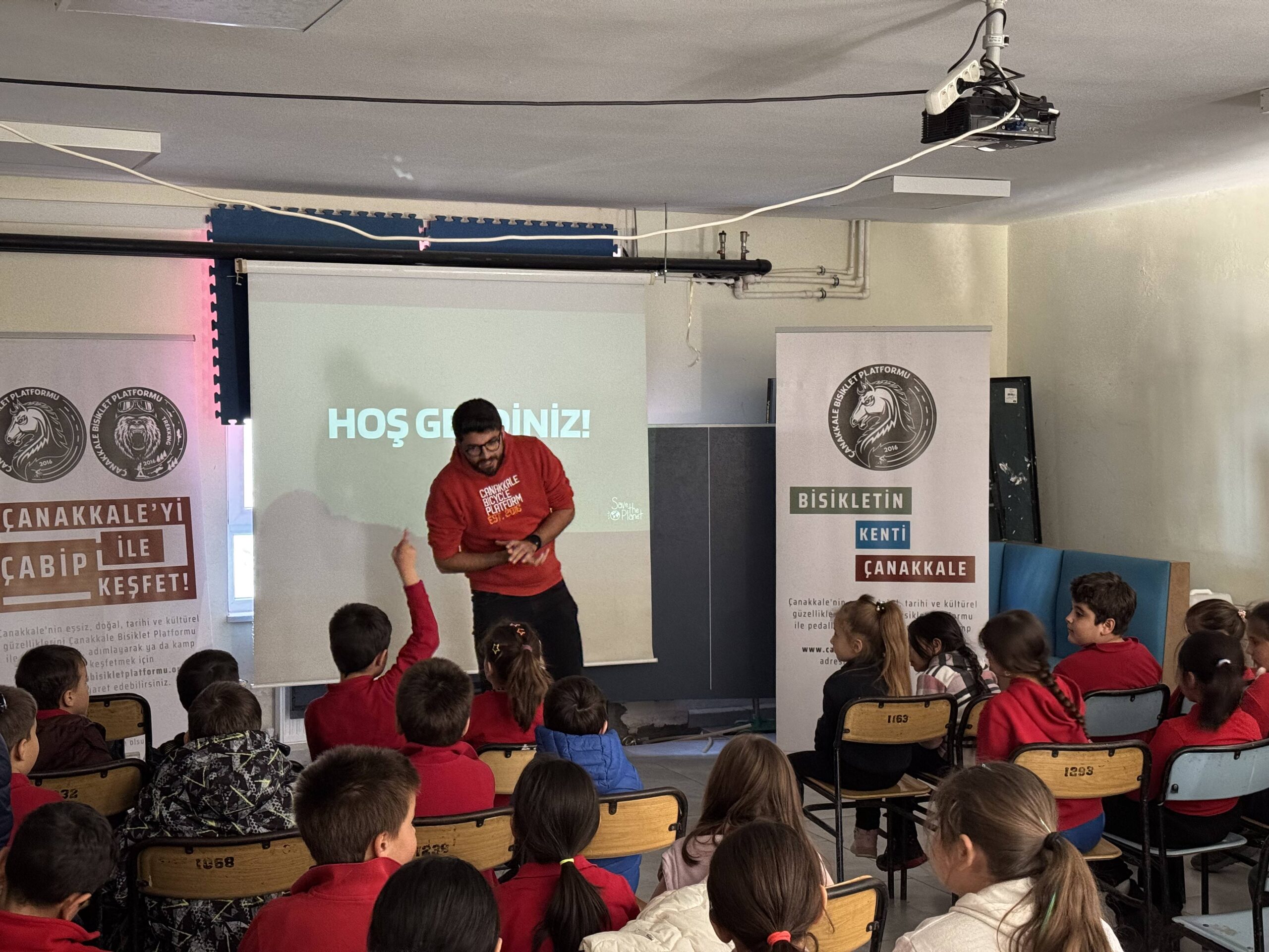Erenköy Ortaokulu ve İlkokulu’nda Bisikletin Kenti Çanakkale mottomuz kapsamında Çanakkale Bisiklet Platformu kimdir, projeleri, bisiklet turları, doğa yürüyüşleri ve diğer faaliyetleri nelerdir, bisikleti tanıyalım, bisiklet seçimi, güvenli sürüş, bisikletlilerin yolu motorlu araç sürücüleriyle paylaşırken yapması gerekenler, 2918 Sayılı TCK KARAYOLLARI Trafik Kanununda Bisiklet, Karayolları Trafik Yönetmeliği’ne göre bisikletlerde bulunması gereken teçhizatlar ve soru-cevap şeklinde söyleşimizi gerçekleştirdik.