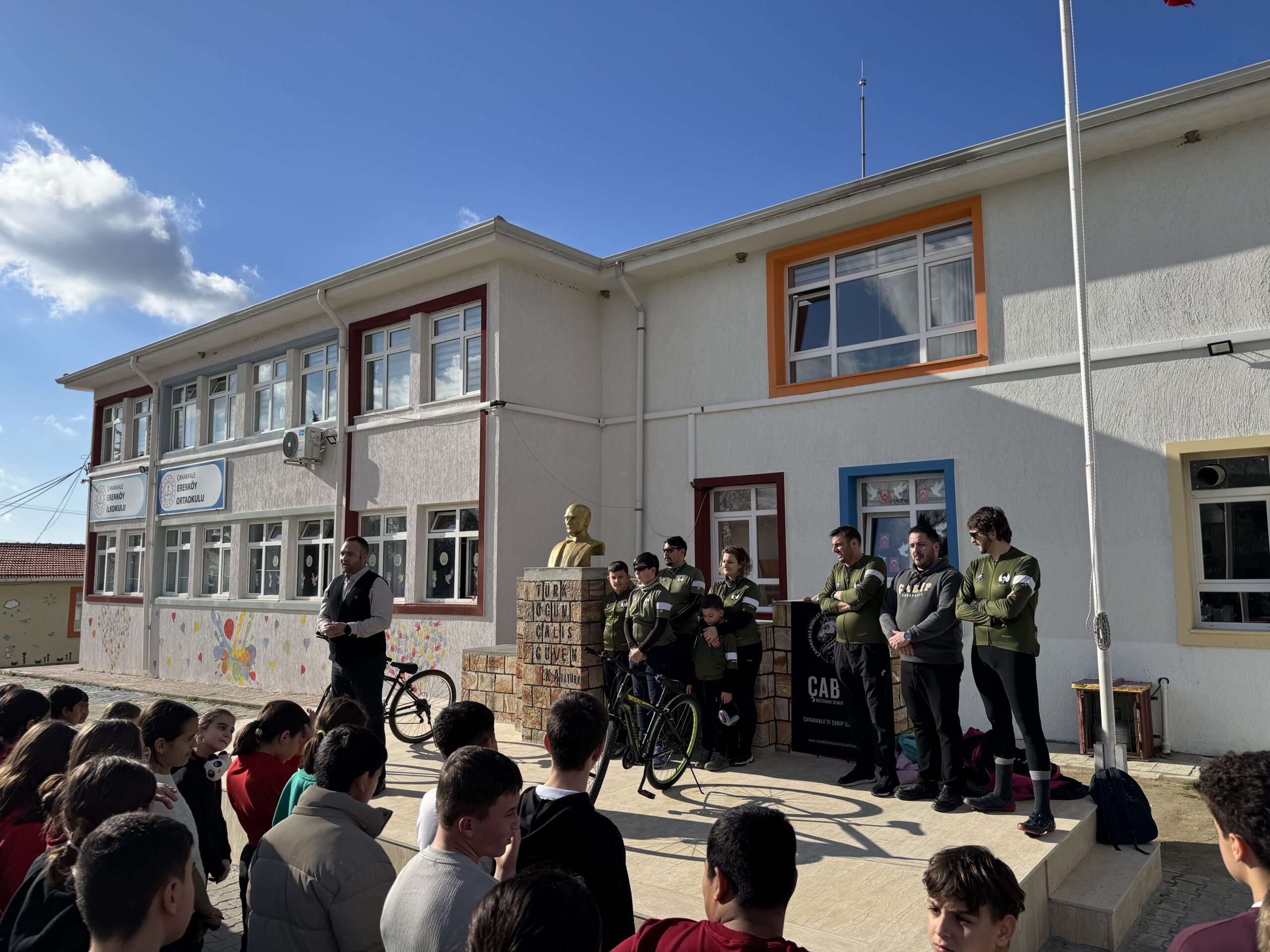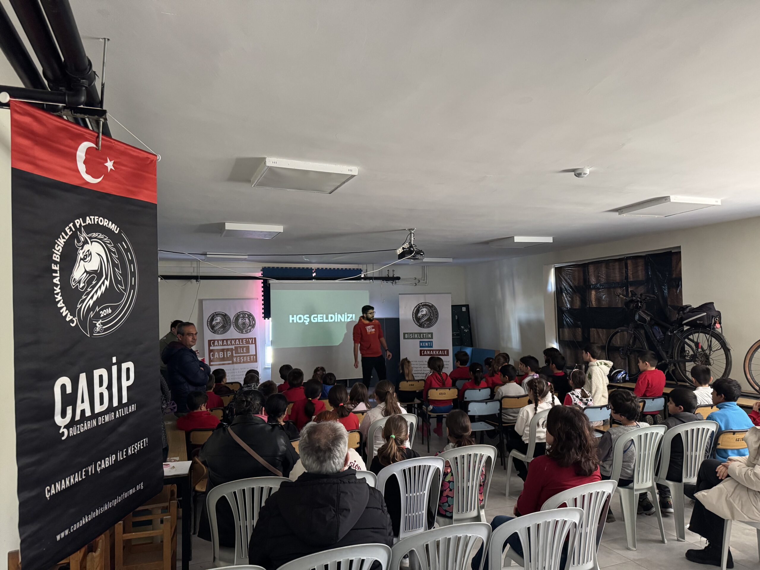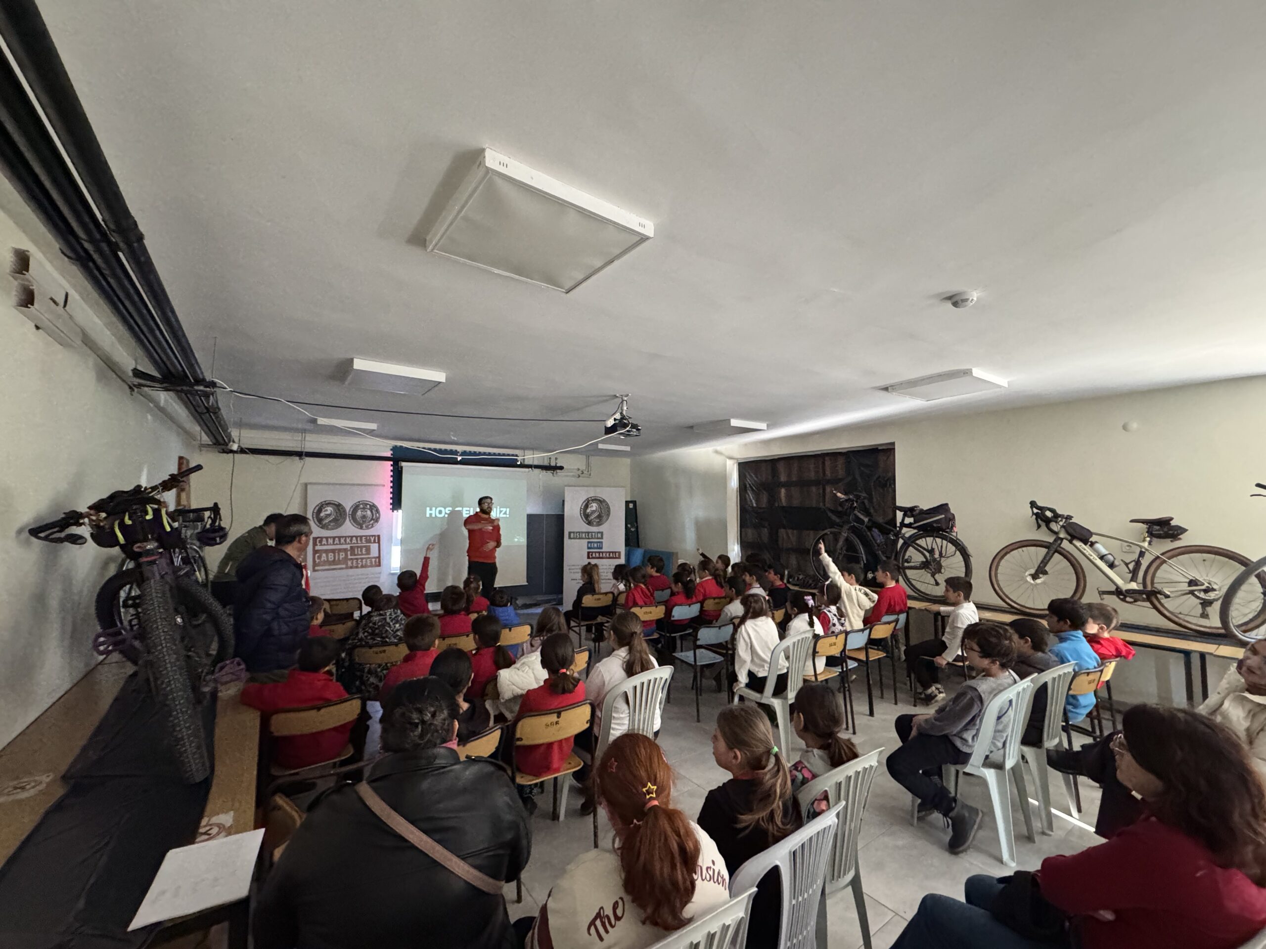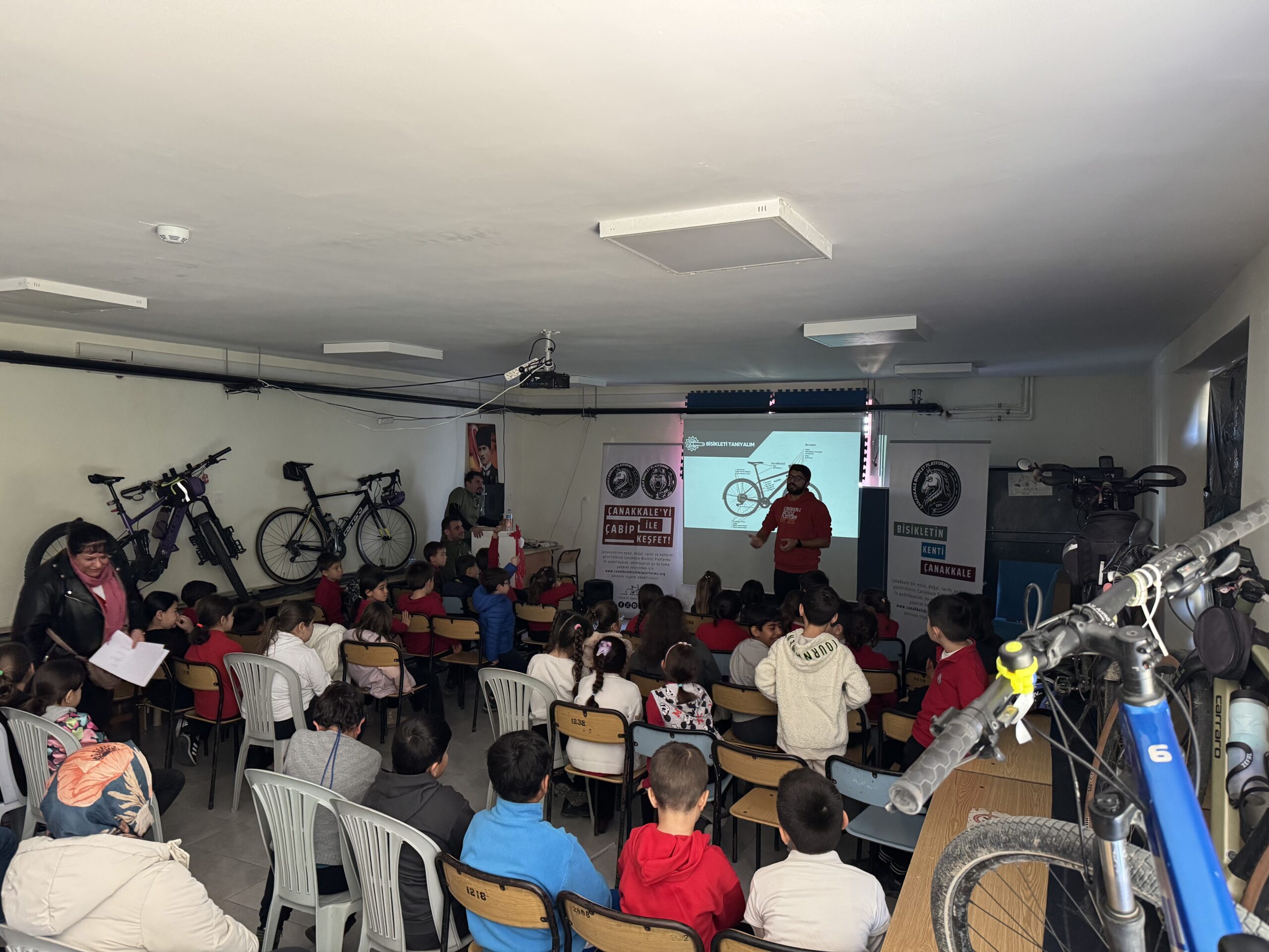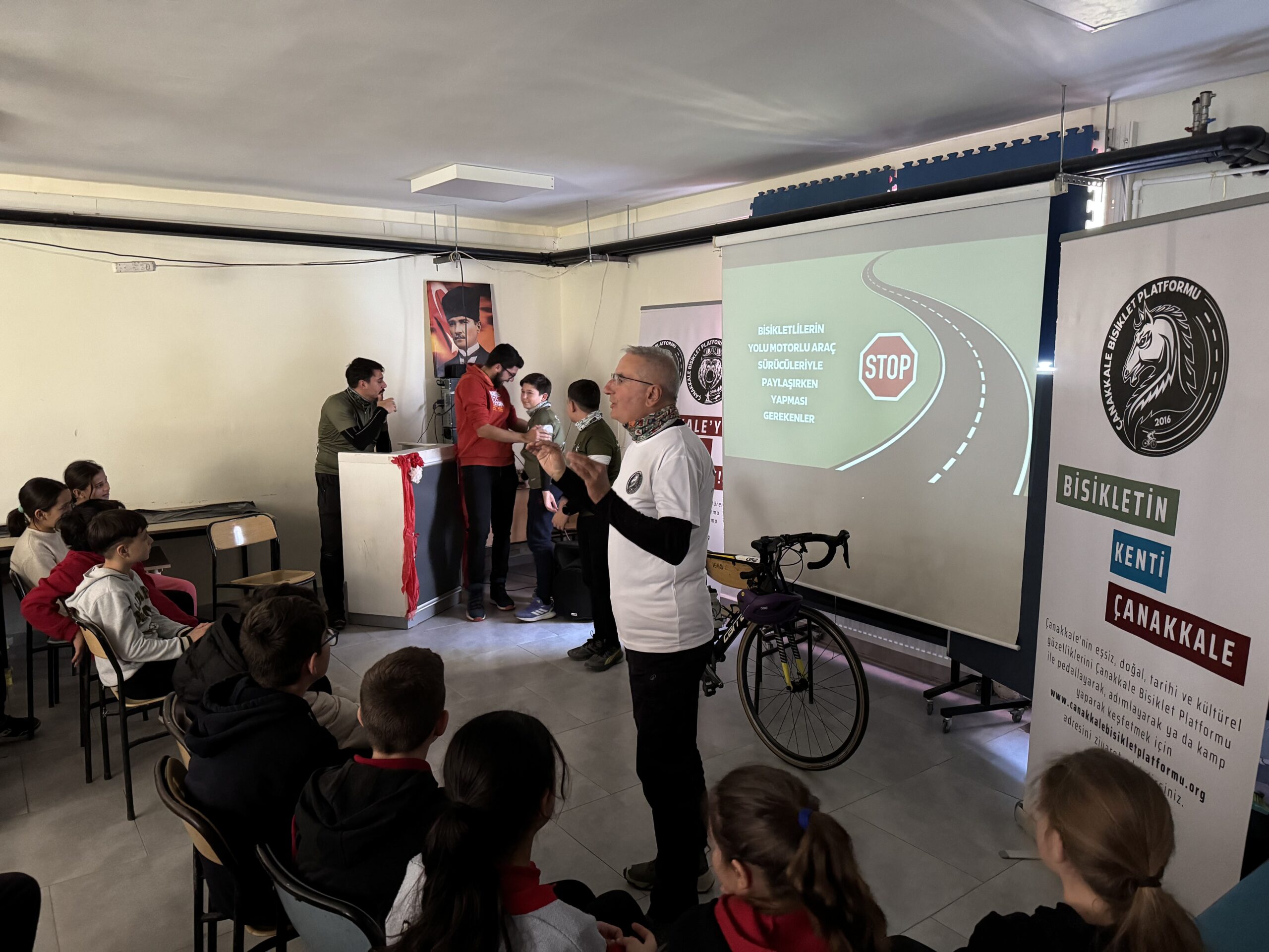 Erenköy Ortaokulu ve İlkokulu’nda Bisikletin Kenti Çanakkale mottomuz kapsamında Çanakkale Bisiklet Platformu kimdir, projeleri, bisiklet turları, doğa yürüyüşleri ve diğer faaliyetleri nelerdir, bisikleti tanıyalım, bisiklet seçimi, güvenli sürüş, bisikletlilerin yolu motorlu araç sürücüleriyle paylaşırken yapması gerekenler, 2918 Sayılı TCK KARAYOLLARI Trafik Kanununda Bisiklet, Karayolları Trafik Yönetmeliği’ne göre bisikletlerde bulunması gereken teçhizatlar ve soru-cevap şeklinde söyleşimizi gerçekleştirdik.