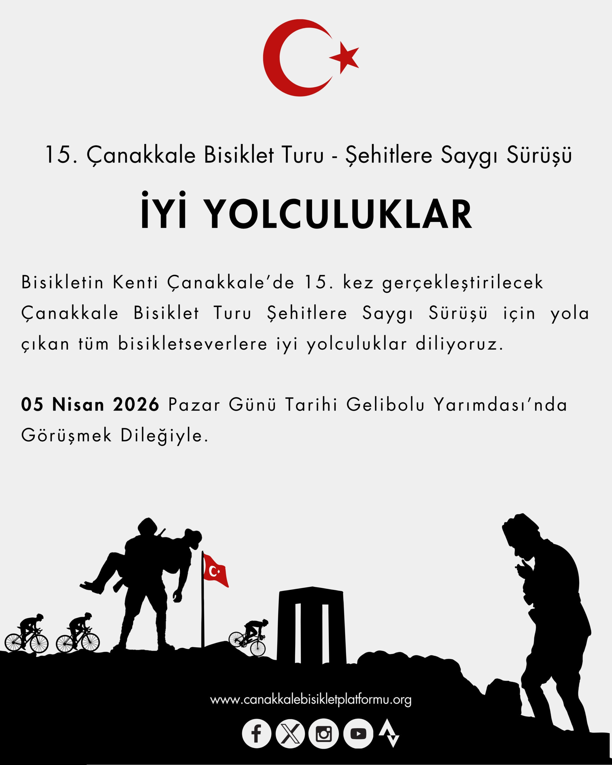 Bisikletin Kenti Çanakkale’de 15. kez gerçekleştirilecek Çanakkale Bisiklet Turu Şehitlere Saygı Sürüşü için yola çıkan tüm bisikletseverlere iyi yolculuklar diliyoruz.