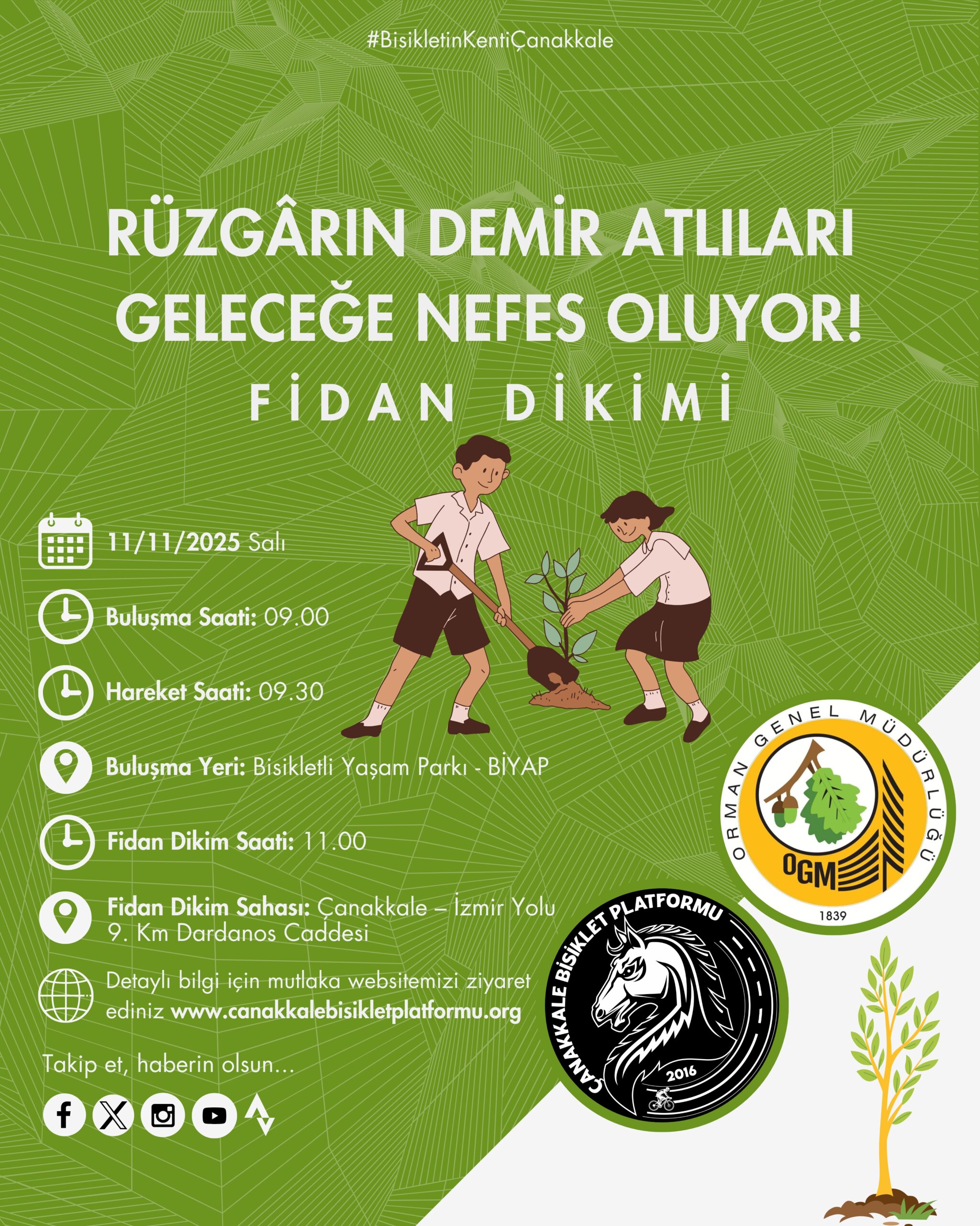 Doğanın bize sunduğu en değerli hazine, yaşam kaynağımızdır. Ancak son yıllarda küresel ısınma ve iklim değişikliği gibi tehditlerle karşı karşıya kalmış, doğanın dengesi bozulmuş, ormanlarımız yangınlarla ve tahribatlarla karşı karşıya kalmıştır. Bu sorunlarla yüzleşmek ve çözüm bulmak, hepimizin sorumluluğundadır. İşte bu nedenle, Çanakkale Bisiklet Platformu olarak “Rüzgârın Demir Atlıları Geleceğe Nefes Oluyor” sloganımız ile 11 Kasım Milli Ağaçlandırma Günü kapsamında Çanakkale – İzmir Yolu 9. Km Dardanos Caddesi’nde belirlenen alana Çanakkale Orman Bölge Müdürlüğü’nün koordinasyonunda nefes olmaya, fidan dikmeye gidiyoruz.
