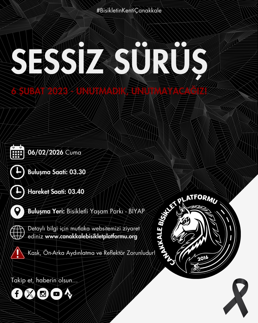 Depremde kaybettiğimiz vatandaşlarımızı anmak, unutmadığımızı ve unutturmayacağımızı göstermek, herhangi bir afet durumunda vatandaşlarımıza destek ve yardım amaçlı bisikletlilerin toplanma alanı olabilecek Bisikletli Yaşam Parkı’ndan (BİYAP), 4.17’de Çanakkale İtfaiye Müdürlüğü’nde olacak şekilde bisikletlerimiz ile sessiz sürüş gerçekleştireceğiz.