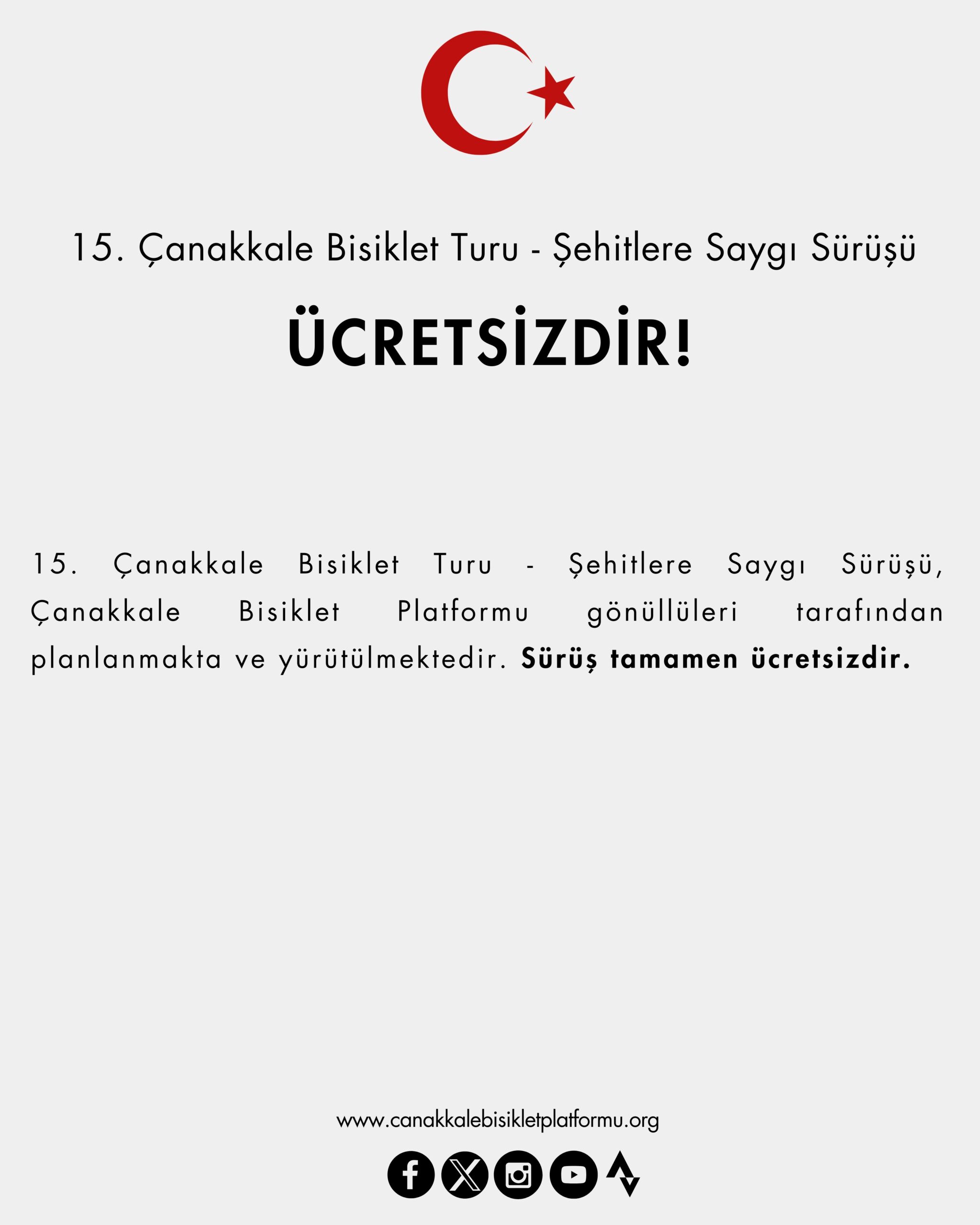 15. Çanakkale Bisiklet Turu – Şehitlere Saygı Sürüşü, Çanakkale Bisiklet Platformu gönüllüleri tarafından planlanmakta ve yürütülmektedir. Sürüş tamamen ücretsizdir.